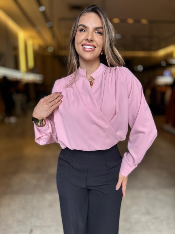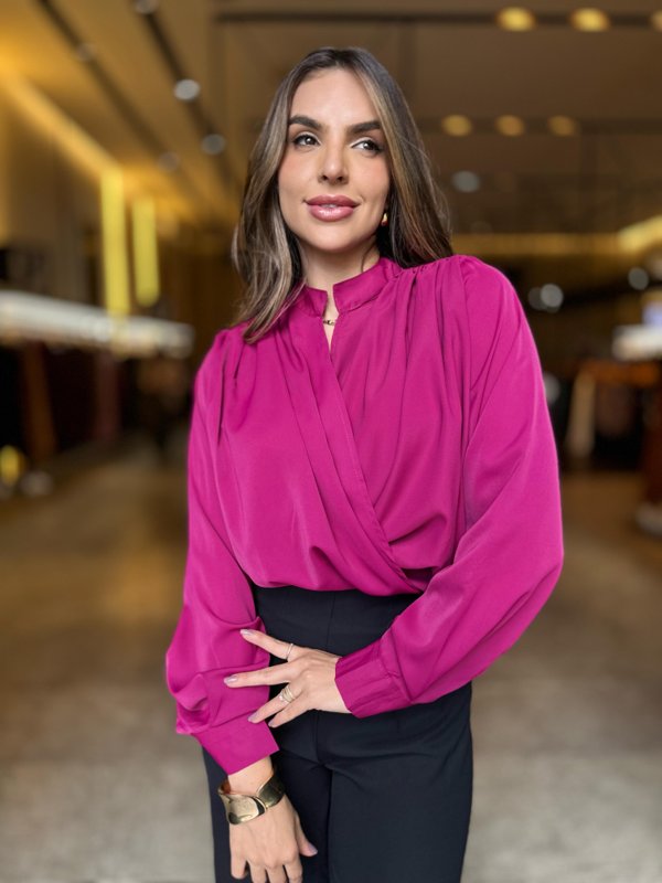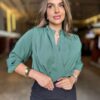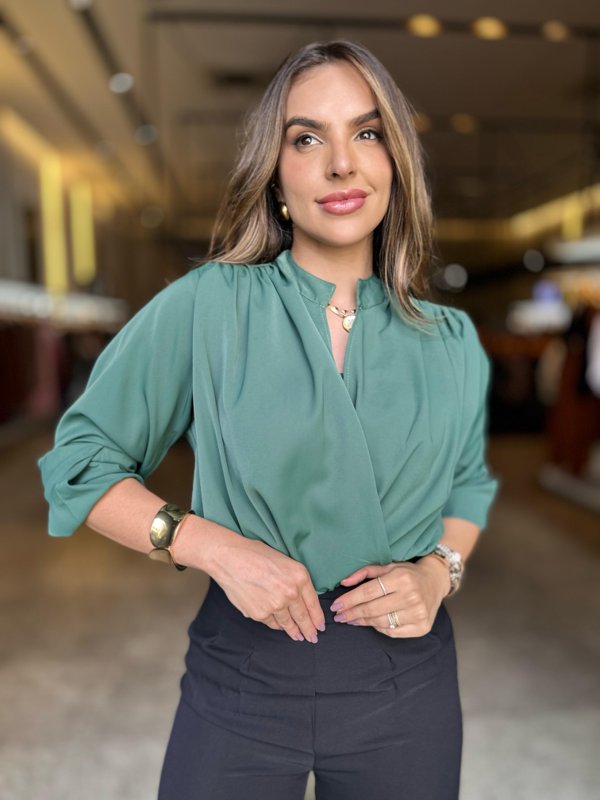 Possui mangas longas com punhos abotoados e detalhes de pregas nos ombros, conferindo um caimento elegante e sofisticado.