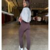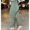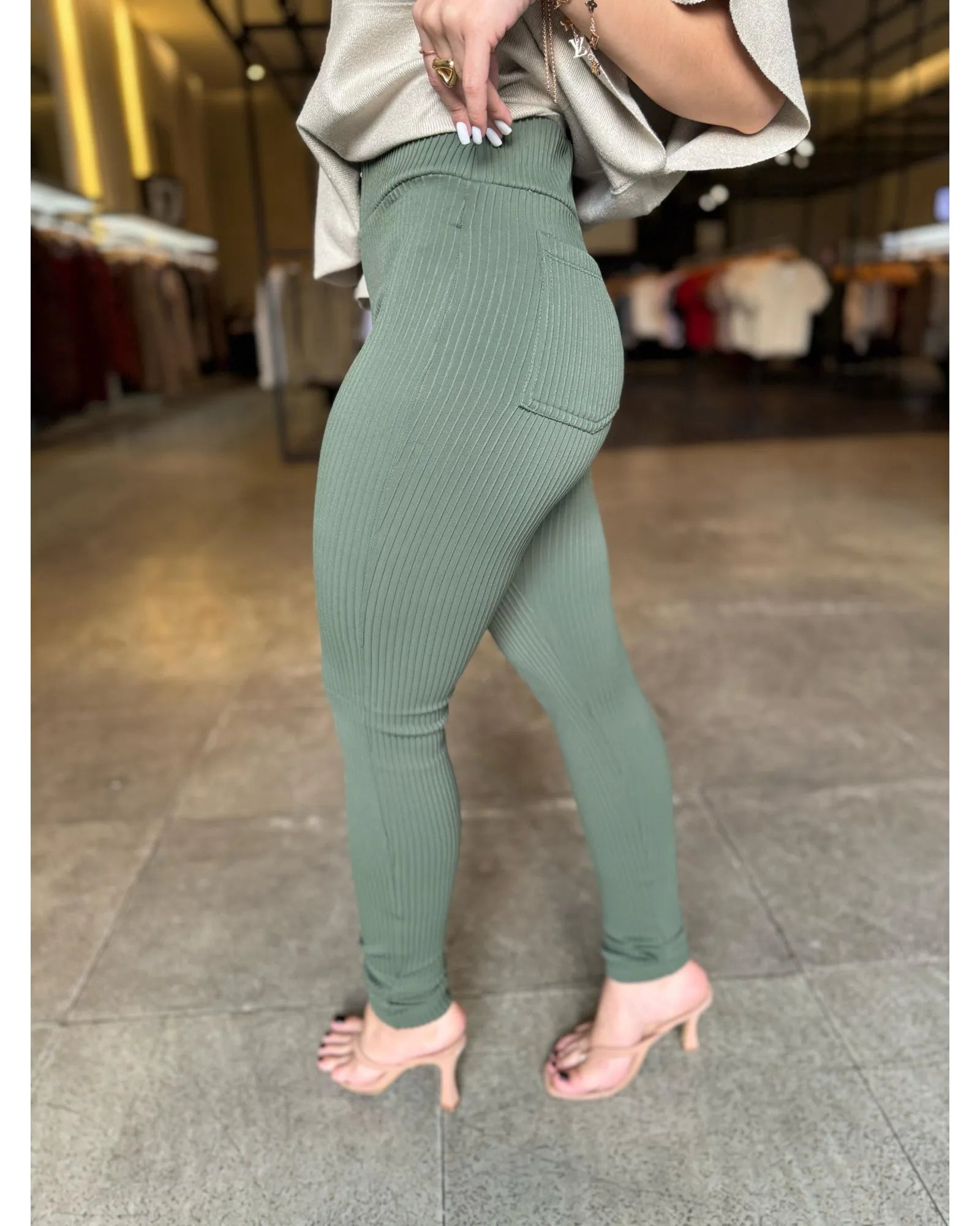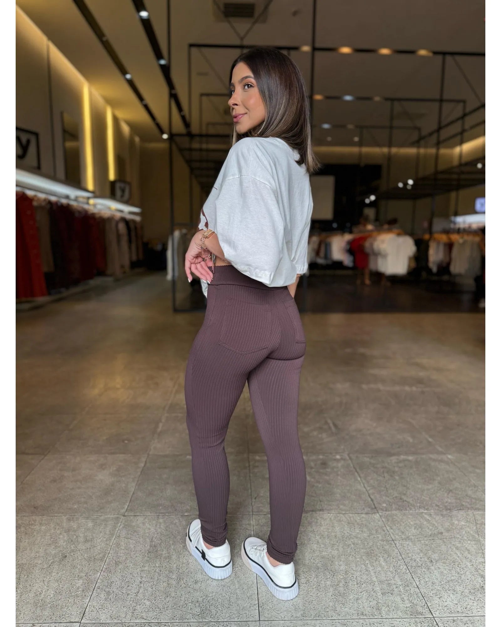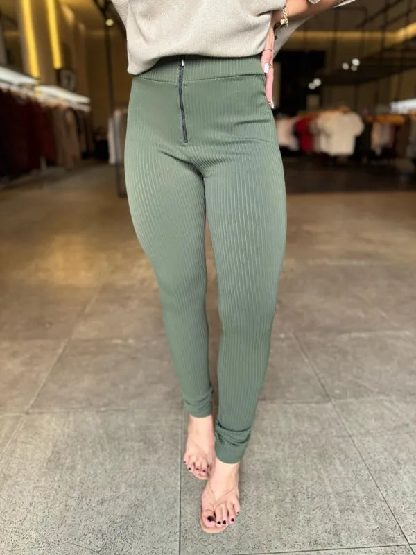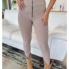 Calça de tecido canelado, corte reto, com zíper frontal e bolsos traseiros . moderna e elegante