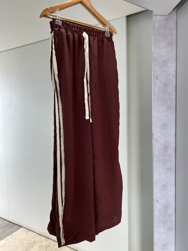 Com cós elástico que se ajusta ao corpo e amarração fake na parte frontal, o modelo une praticidade e estilo. A listra lateral discreta adiciona um toque de modernidade, enquanto as cores marrom e preto são perfeitas para composições elegantes e fáceis de combinar.