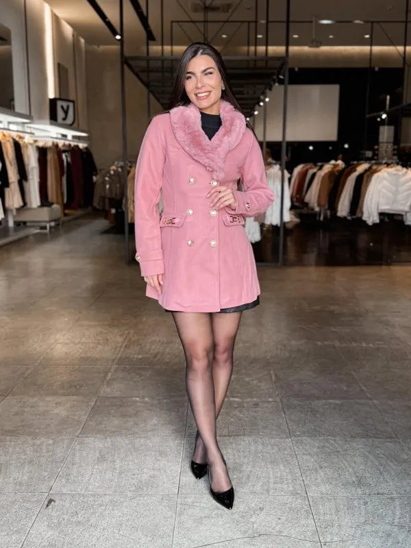 Seu design traz abertura frontal com botões, detalhes em botão nas mangas e bolsos frontais decorativos, que adicionam charme à peça sem comprometer a silhueta. A gola peluciada e removível é um diferencial que permite transformar o visual com facilidade — do elegante ao casual chic.