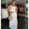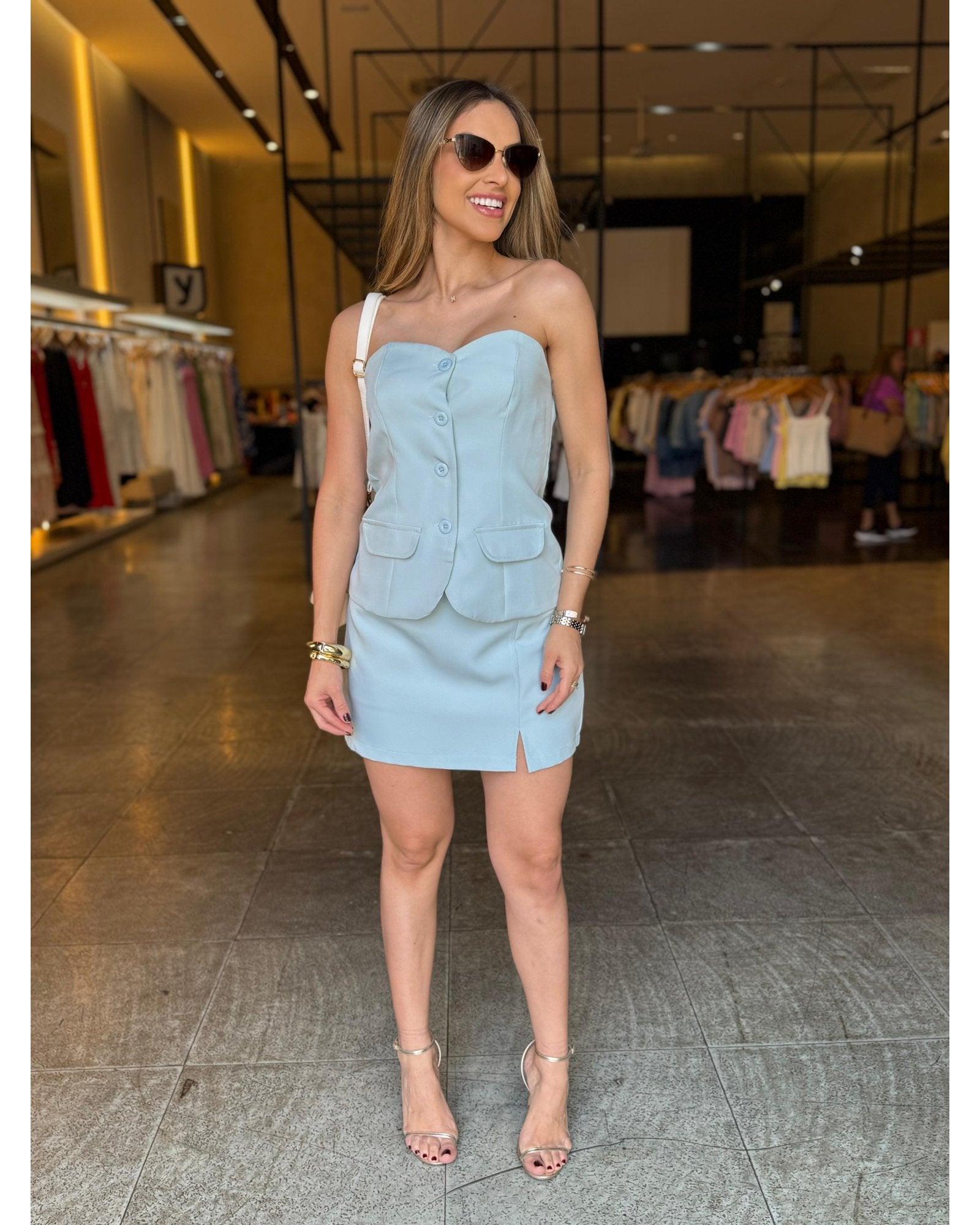 Conjunto em crepe alfaiataria, a escolha perfeita para quem busca sofisticação com um toque moderno. O modelo é composto por um corpete estruturado estilo tomara que caia, com botões frontais e bolsos decorativos, que garantem charme e elegância. A o short saia reto traz fenda frontal delicada, oferecendo conforto e movimento ao look.