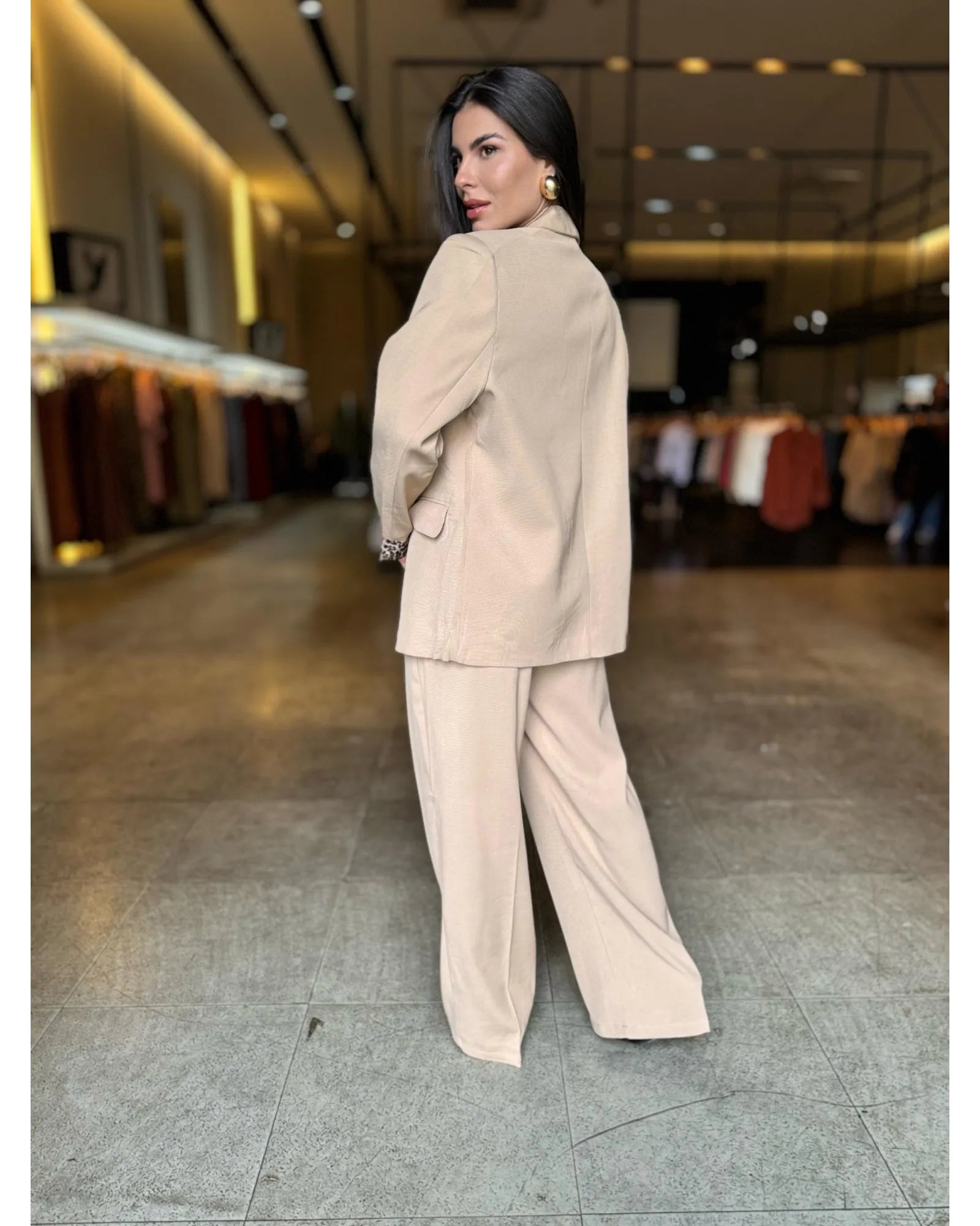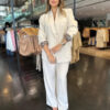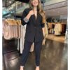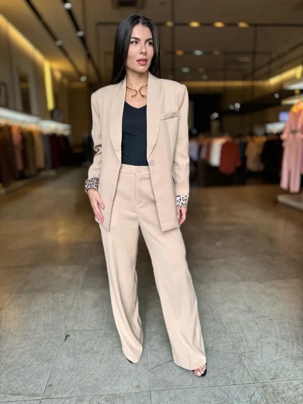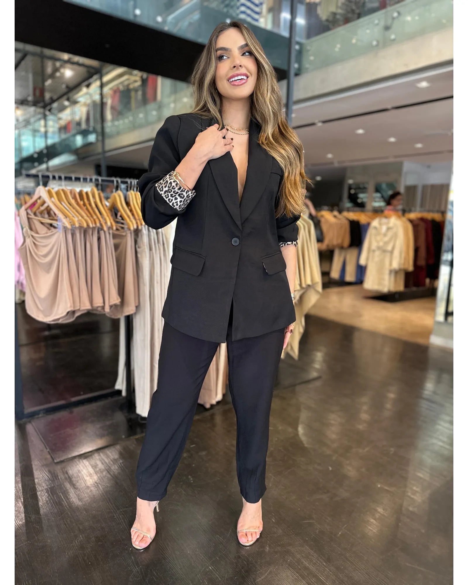Conjunto Blazer Isa é um look sofisticado e moderno, com detalhes na manga em estampa de onça no forro do Blazer e nas mangas. Possui ombreiras, abertura em decote V com fechamento em botões.