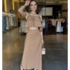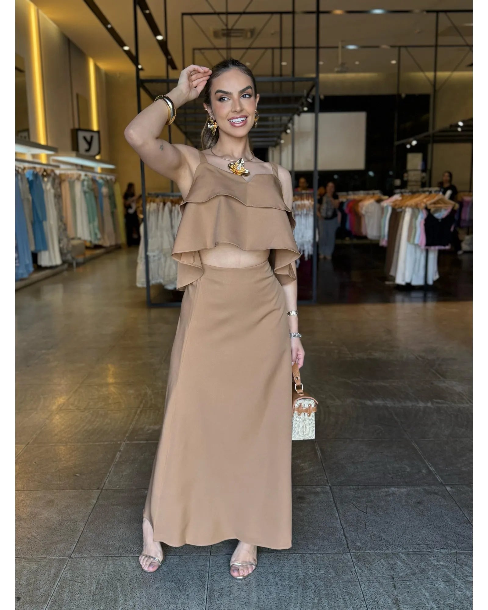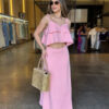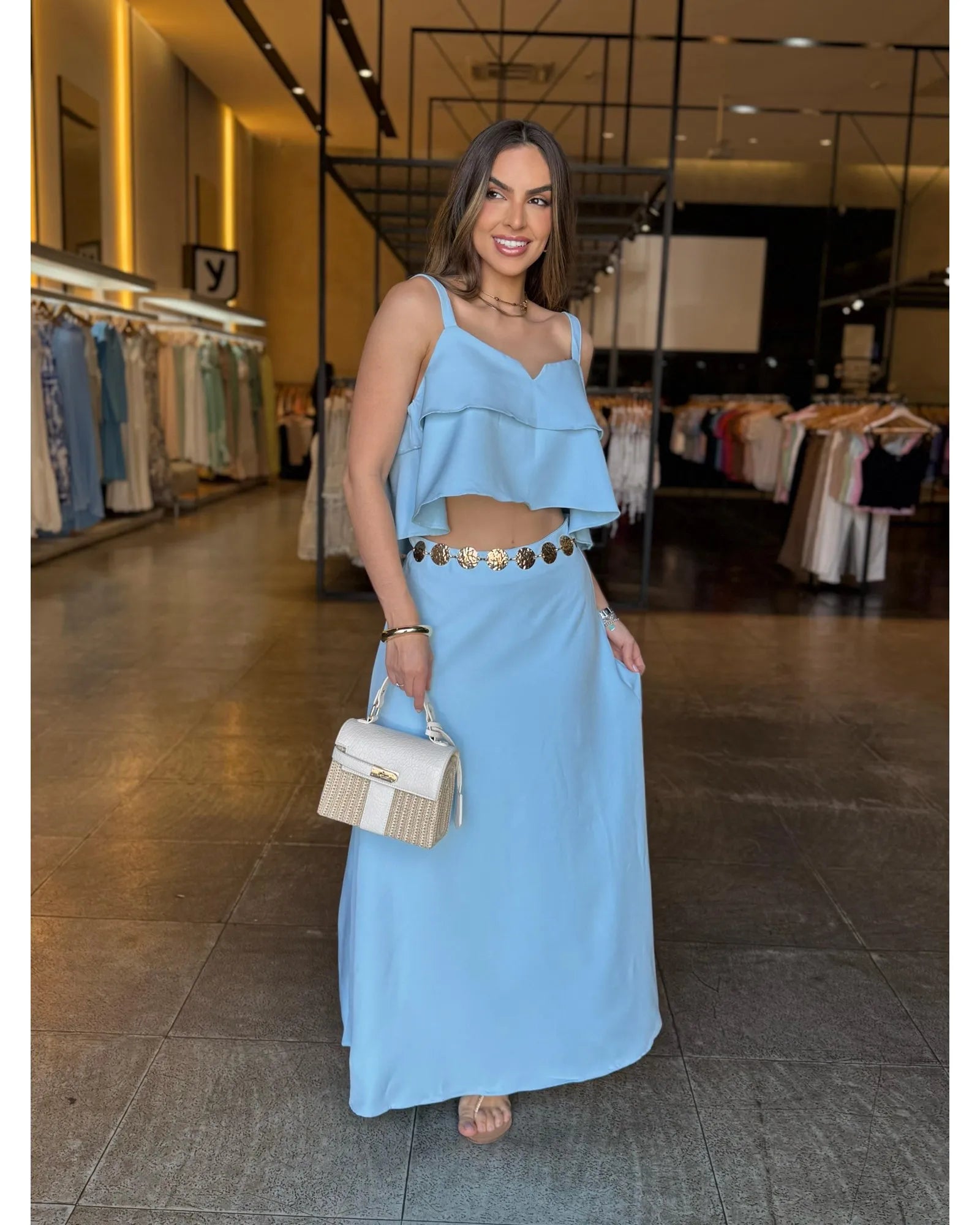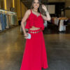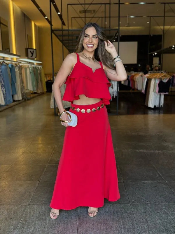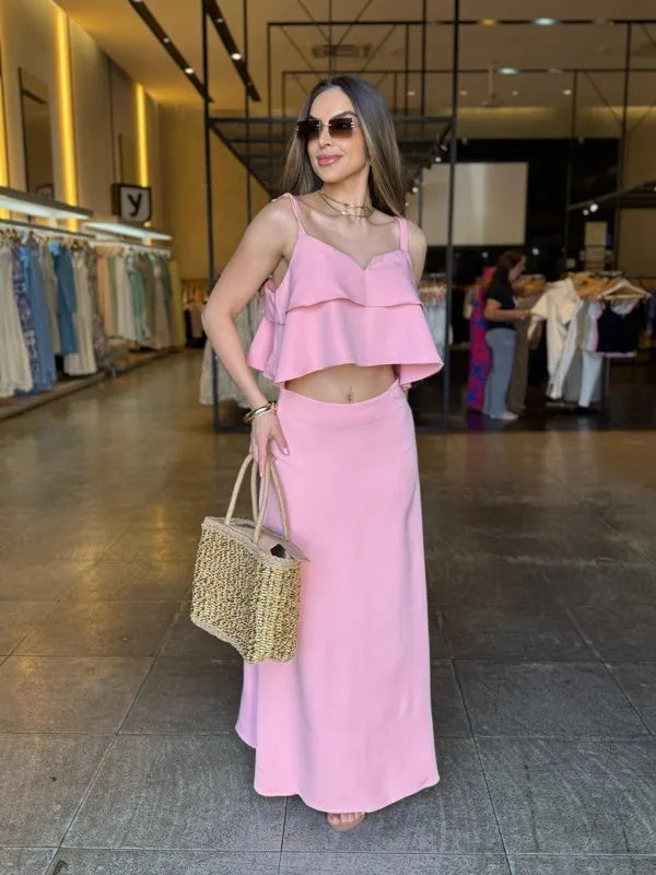 Um conjunto que une conforto e estilo com muita elegância! O cropped modelo mais soltinho, com detalhes em babado, alças finas e decote em “V”, enquanto a saia midi fluida traz um caimento leve, perfeito para compor looks femininos e modernos.
