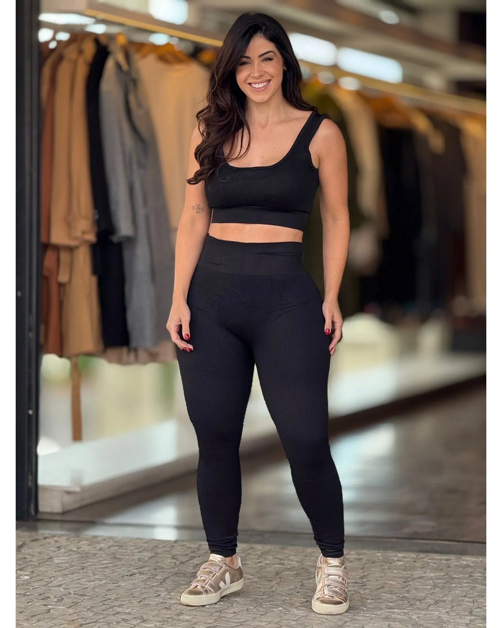 O Conjunto Fitness Rafa é a união perfeita entre estilo, conforto e performance! Confeccionado em tecido canelado premium, oferece toque suave, excelente elasticidade e ajuste ao corpo. O conjunto é composto por cropped com bojo removível, que garante sustentação e valorização do busto, e calça legging com modelagem empina bumbum, desenhada para realçar suas curvas com segurança e estilo. Ideal para treinos ou para compor um look athleisure moderno, o Conjunto Rafa está disponível em tamanhos até o GG, atendendo diferentes tipos de corpo com a mesma elegância e qualidade.