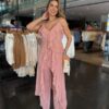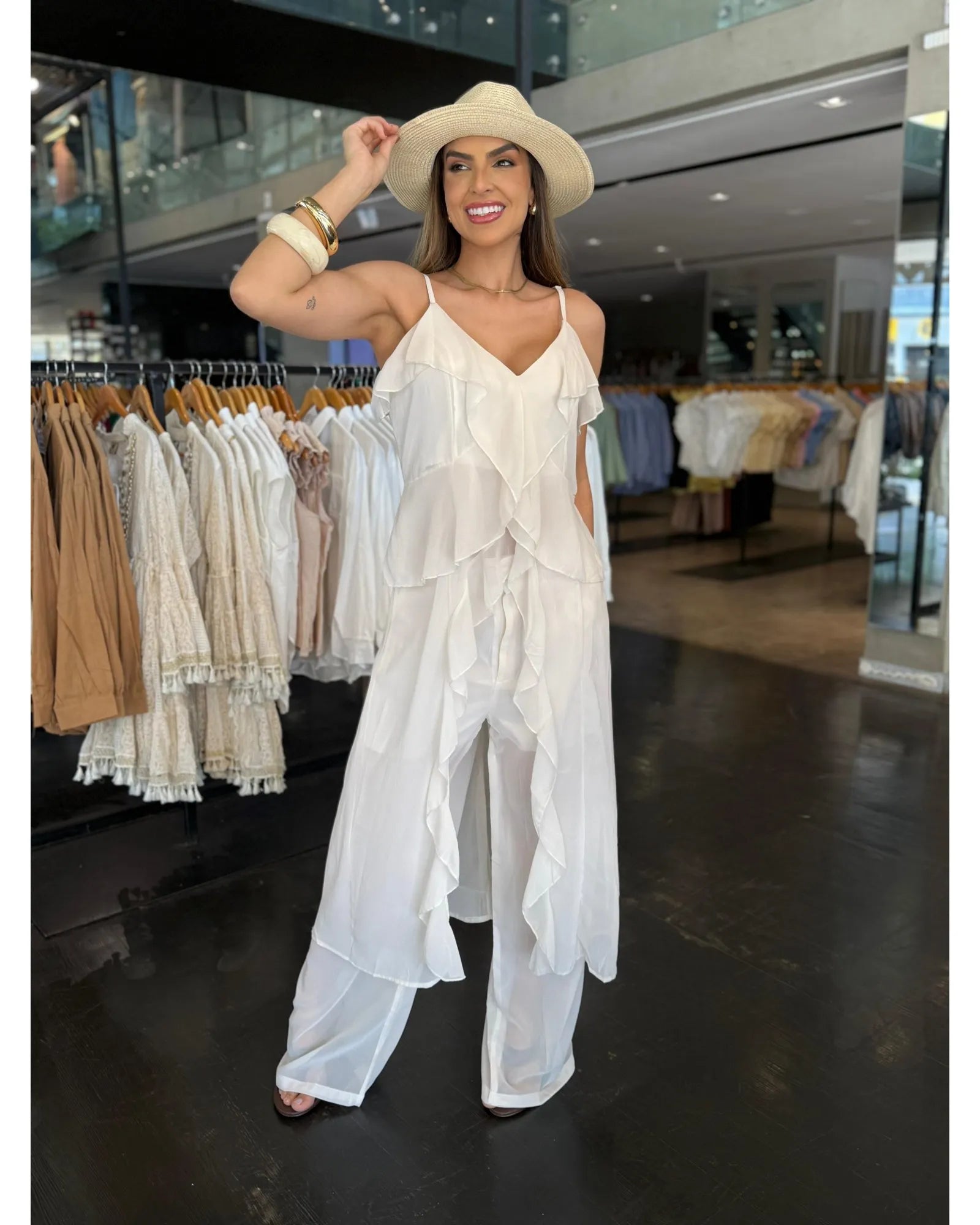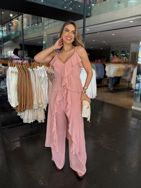 A parte superior possui alças finas, decote em V e detalhes em babados frontais, e parte das costas alongada que valorizam a peça com delicadeza. A calça tem modelagem reta e fluída, cintura alta com botões e recortes laterais com aplicação de babados, garantindo um visual sofisticado e cheio de estilo.