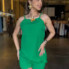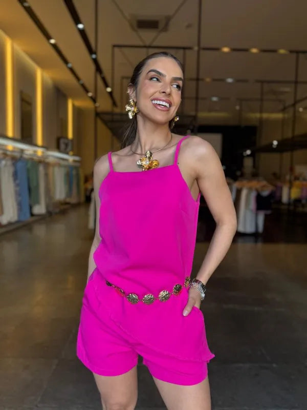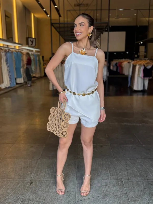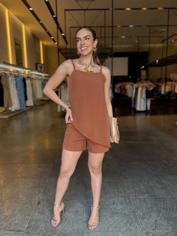 Conforto e elegância se encontram nesse conjunto short alfaiataria e blusa assimétrica, ideal para dias mais quentes — sem abrir mão do estilo! A blusa de alças finas com sobreposição frontal assimétrica cria um visual moderno e fluido, enquanto o short com caimento leve garante frescor e liberdade de movimento.