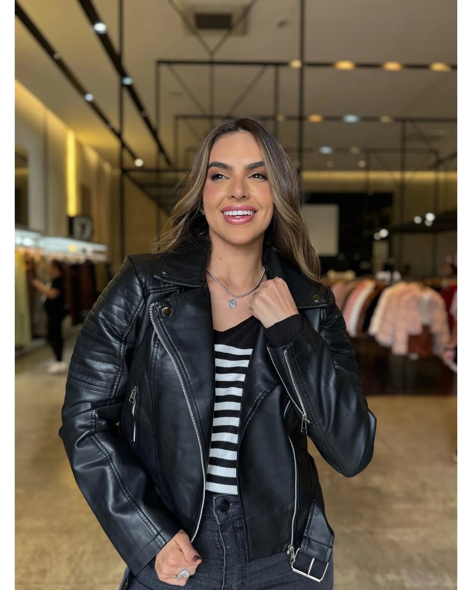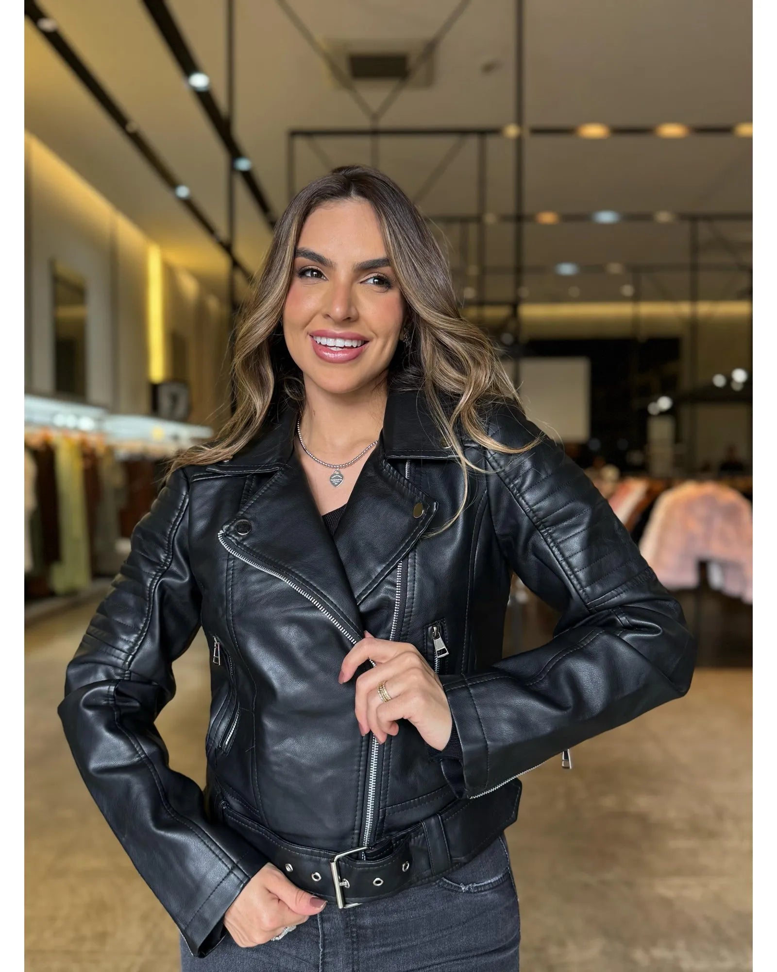 Essa jaqueta em couro sintético é a peça-chave que não pode faltar no seu guarda-roupa. Com abertura frontal em zíper, ela une praticidade e atitude em um design clássico e versátil. Os bolsos frontais com fechamento em zíper garantem segurança e funcionalidade, enquanto o detalhe em cinto na barra inferior adiciona um toque extra de personalidade e ajuste perfeito à silhueta.