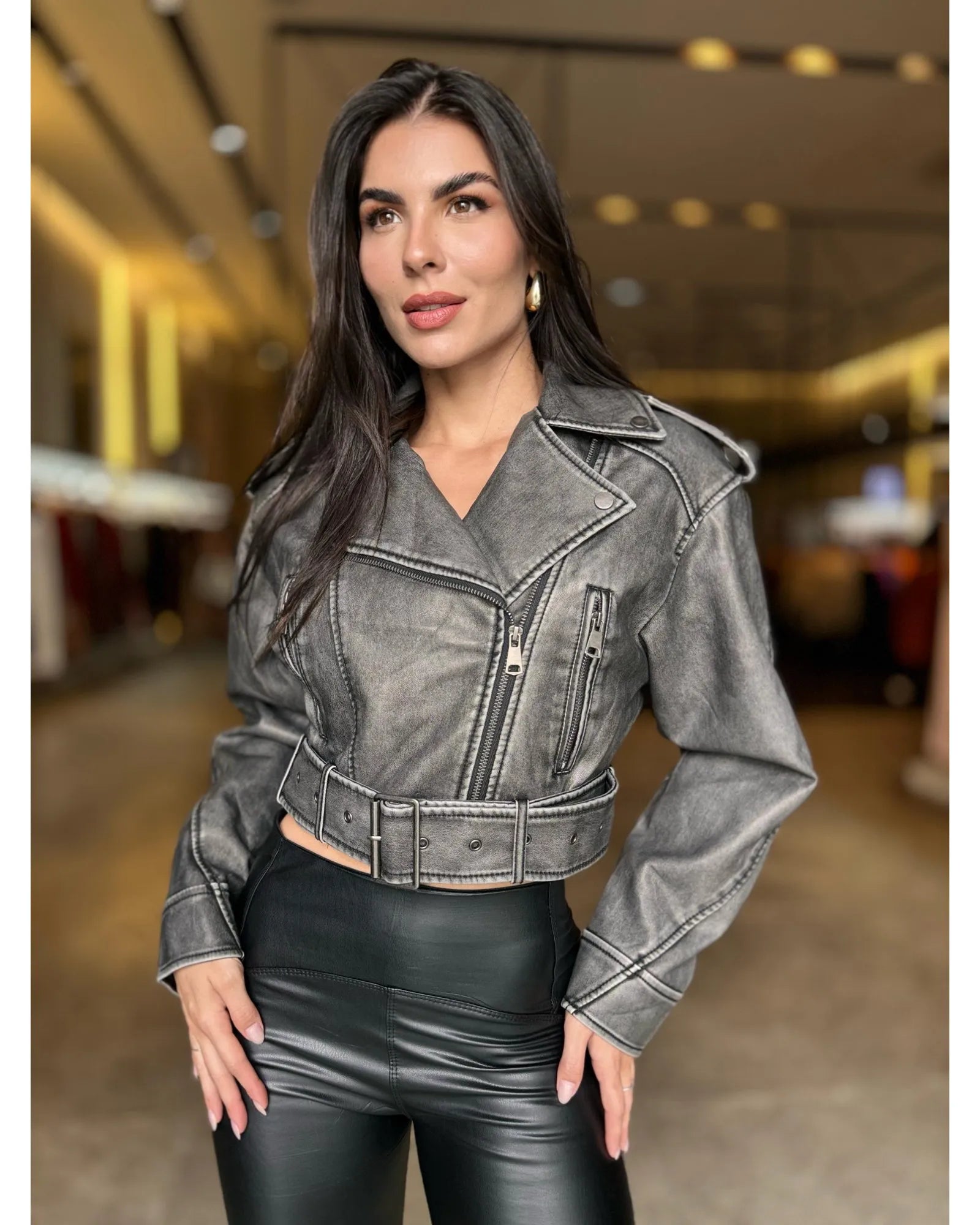 Jaqueta cropped em couro ecológico, com zíper e cinto. Toda forrada por dentro com cetim.