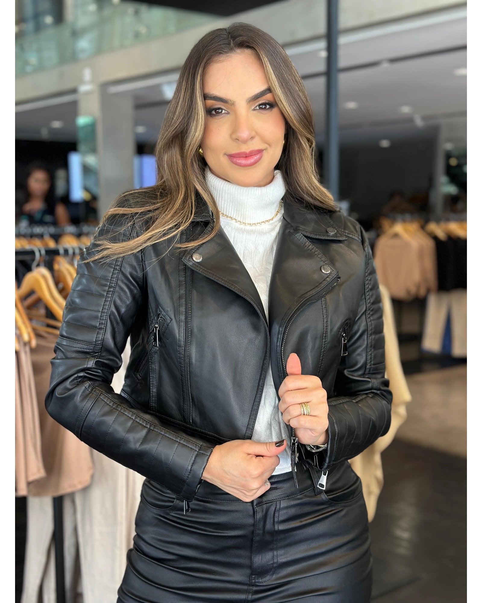 Jaqueta confeccionada em couro sintético com acabamento fosco e estrutura encorpada. Possui gola , fechamento frontal por zíper contém detalhes de zíper nas mangas e bolsos diagonais com zíper funcional. Detalhes nos ombros e nas mangas adicionam um toque moderno e robusto ao visual. A modelagem é cropped .