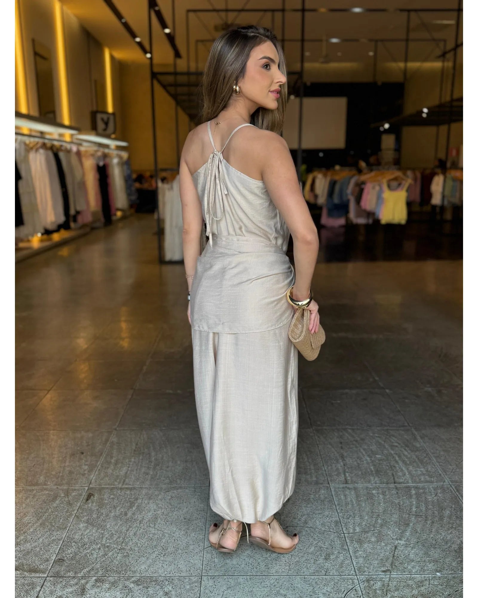 Elegância e versatilidade em uma única peça. Confeccionado em tecido leve e sofisticado, o Macacão Aladin acompanha um lenço refinado, que pode ser usado de diferentes formas, proporcionando múltiplas possibilidades de estilo. Seu design conta com delicada amarração nas costas, realçando a feminilidade e garantindo um caimento impecável.