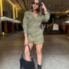 Macaquinho com fechamento frontal por zíper dourado e detalhes utilitários como bolsos com zíper na altura do peito e na parte inferior.