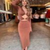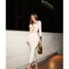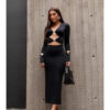 disponível no tamanho único, vestindo 36-42. O vestido é longo com mangas longas e uma sútil fenda na parte de trás. Possui dois decotes no abdômen com detalhes prateados. É bem justo com bastante elasticidade.