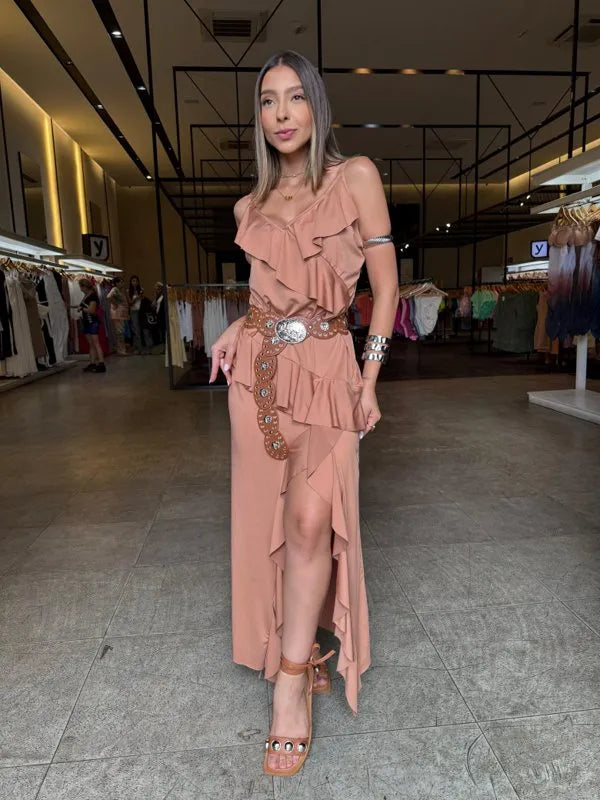 Vestido Fenda Grécia, disponível no tamanho único (36-46)!! Vestido em tecido fluity com bastante elasticidade e fluidez. Possui alça fina, corte V e detalhe sutil de babados por toda parte da frente. Além de uma fenda na lateral.