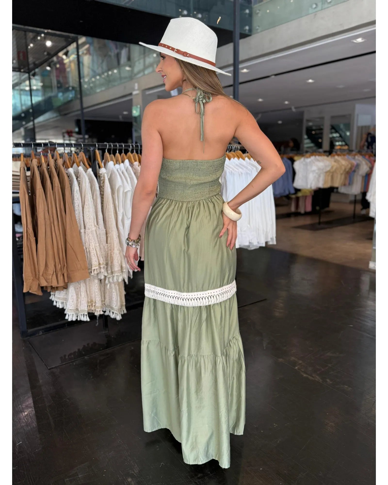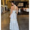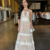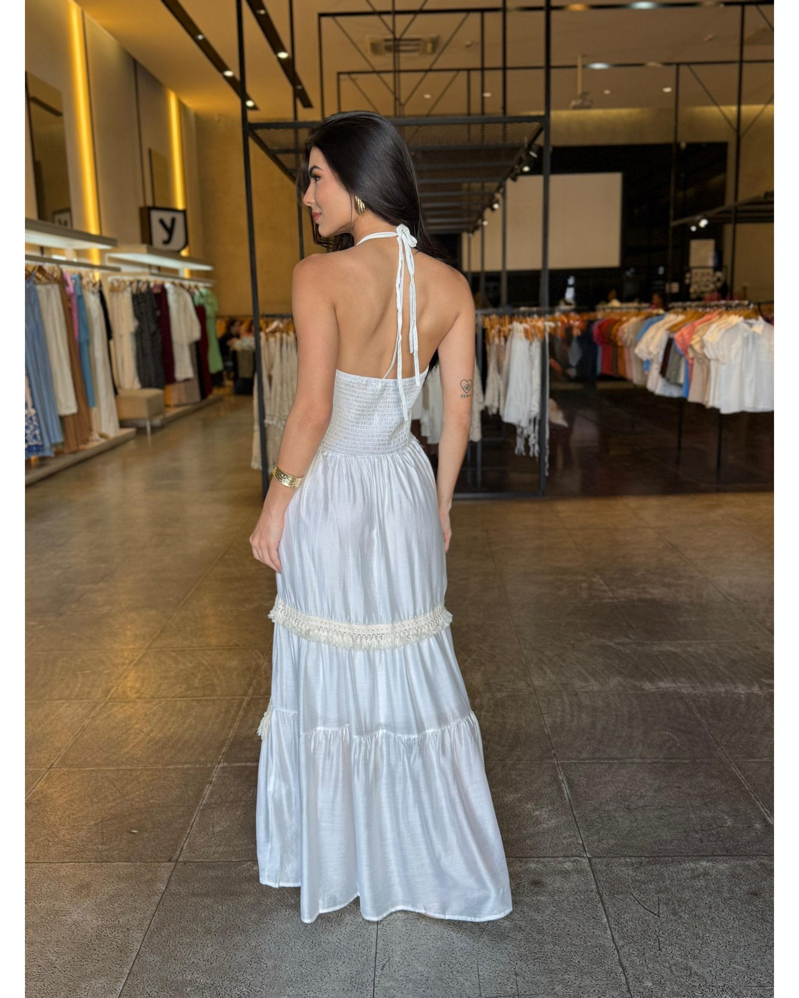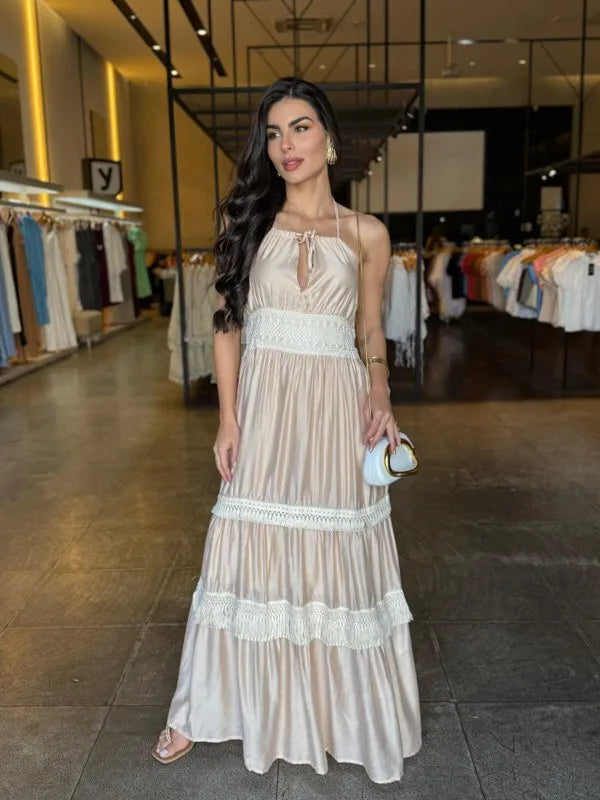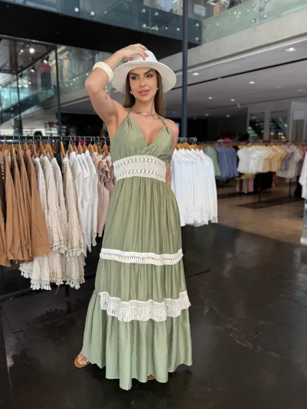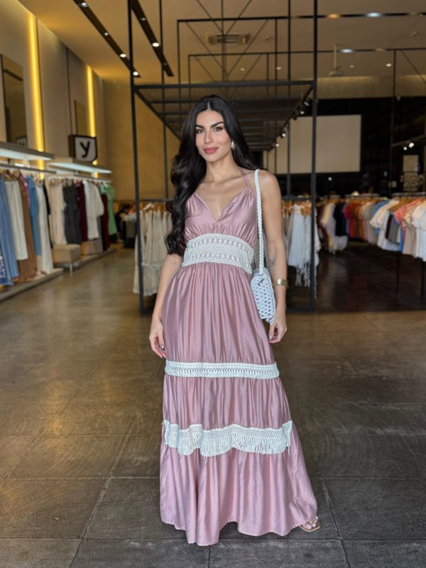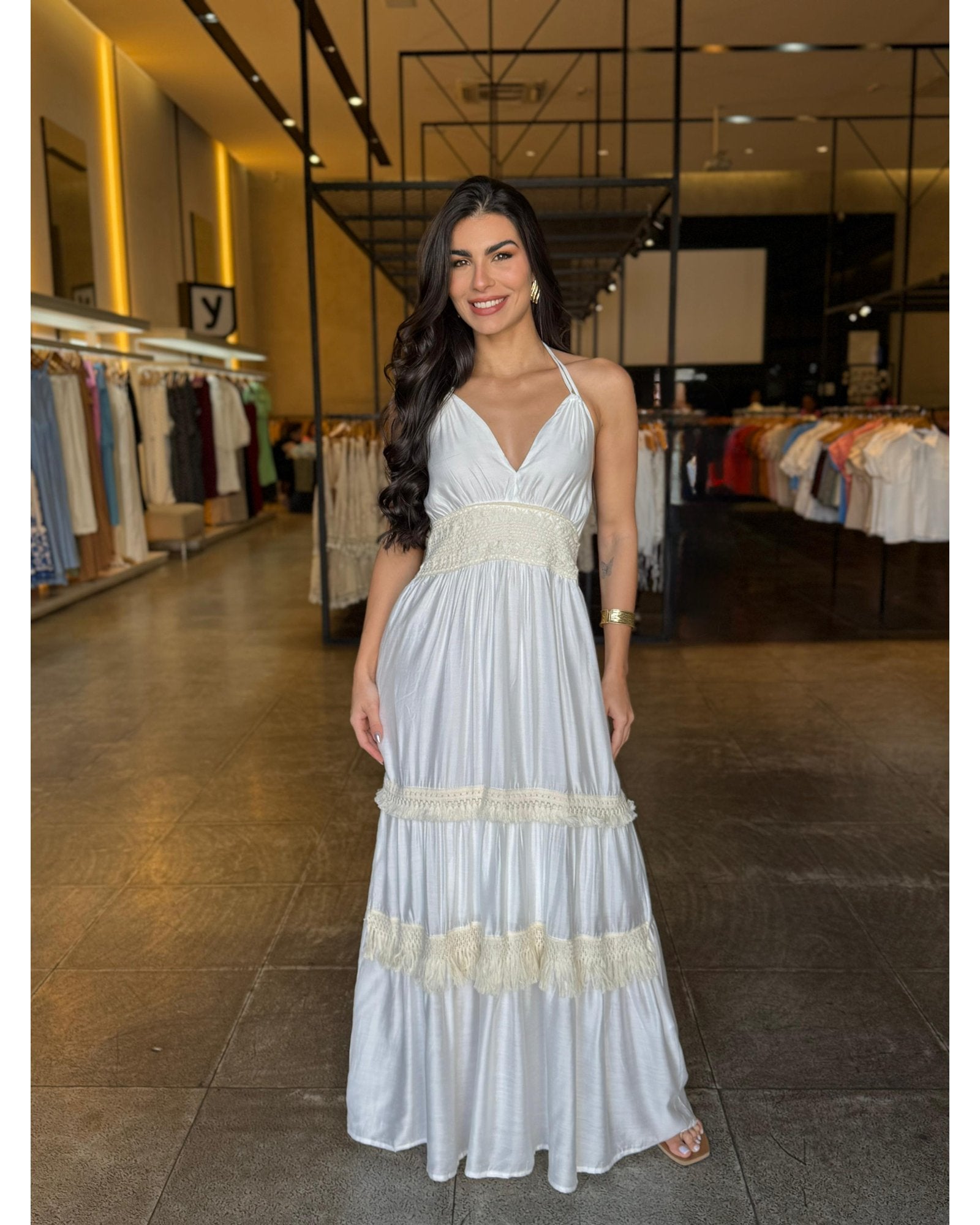 Um modelo encantador que une conforto e sofisticação! Confeccionado em viscolinho com um sutil toque de brilho, este vestido se destaca pelo caimento leve e elegante. Possui decote em V que valoriza o colo, alças finas delicadas, possibilidade de amarrações diferentes no busto, lastex nas costas trazendo melhor ajuste a peça e detalhe em renda trabalhada na cintura e nas faixas da saia, trazendo feminilidade e charme à peça.