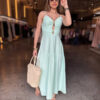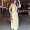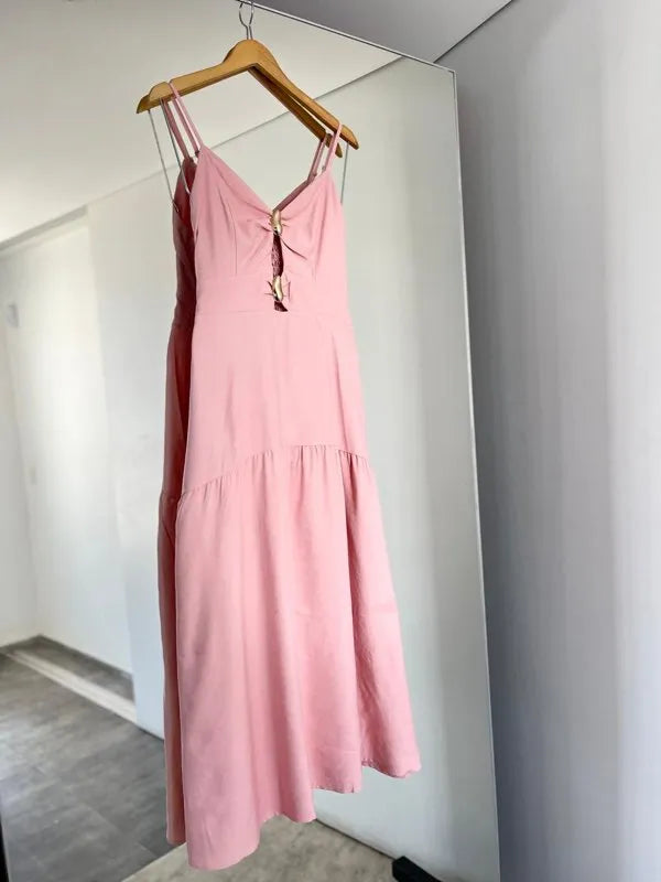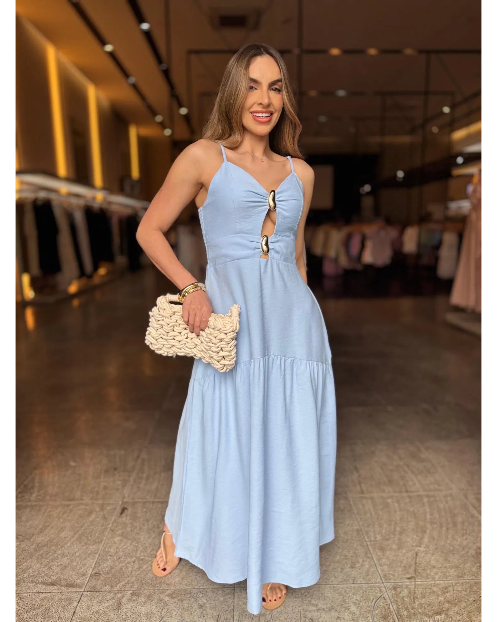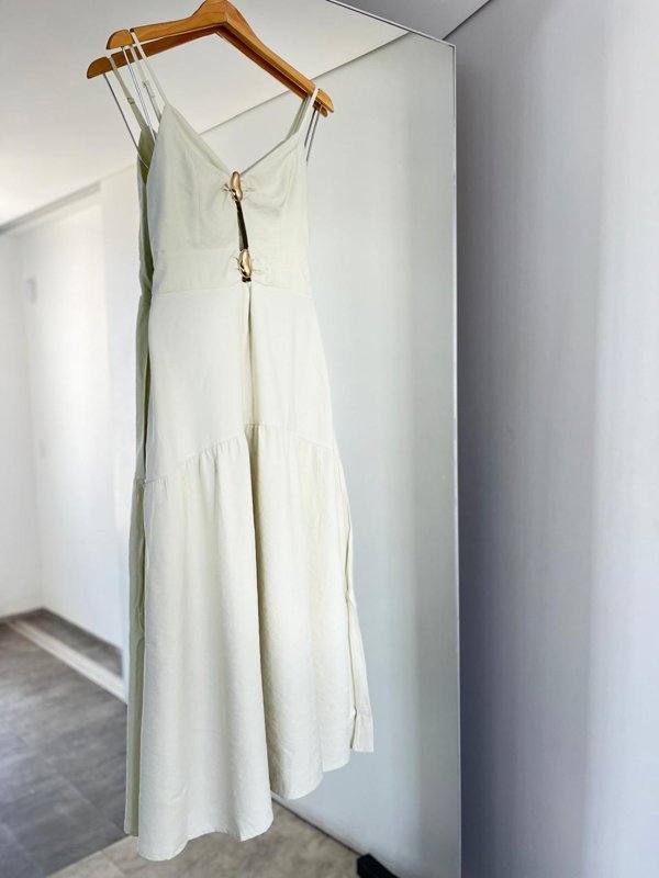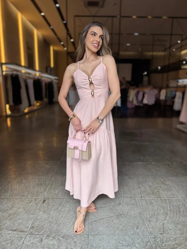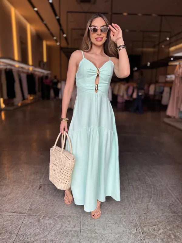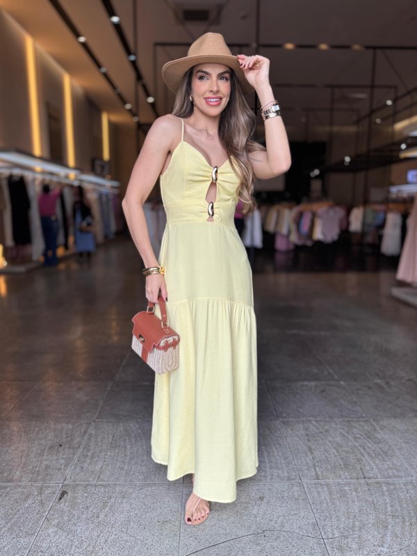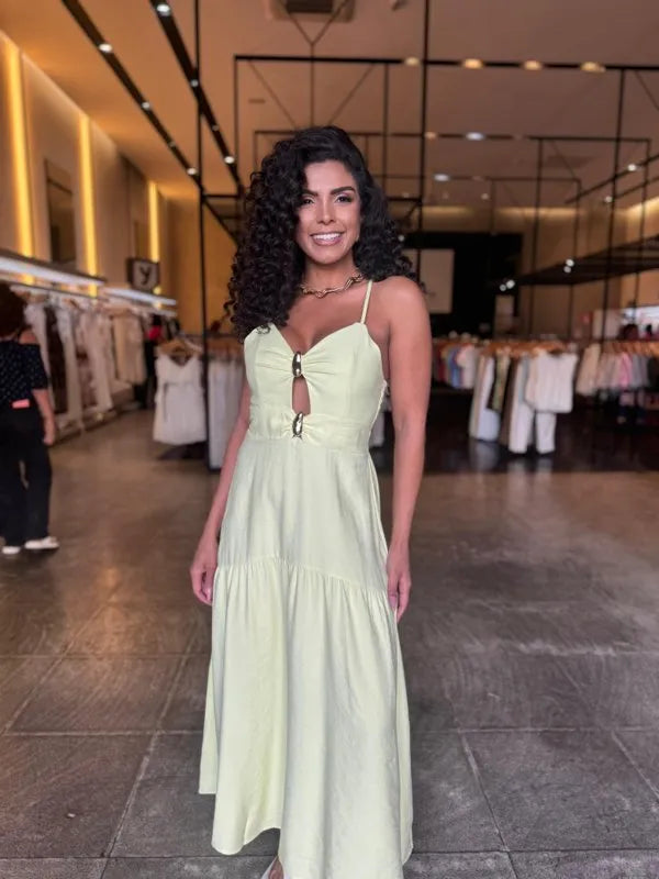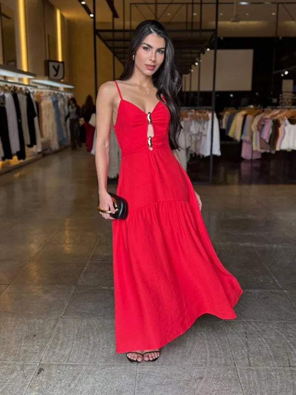 Elegante e confortável, este vestido longo é a escolha perfeita para compor looks sofisticados e frescos. O modelo possui alças finas e detalhe frontal com argolas, que valoriza o decote e traz um toque moderno. Conta com bojo estruturado, garantindo melhor sustentação e caimento, além de lastex nas costas, que proporciona ajuste perfeito ao corpo.