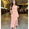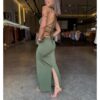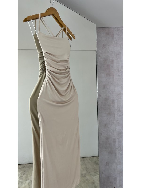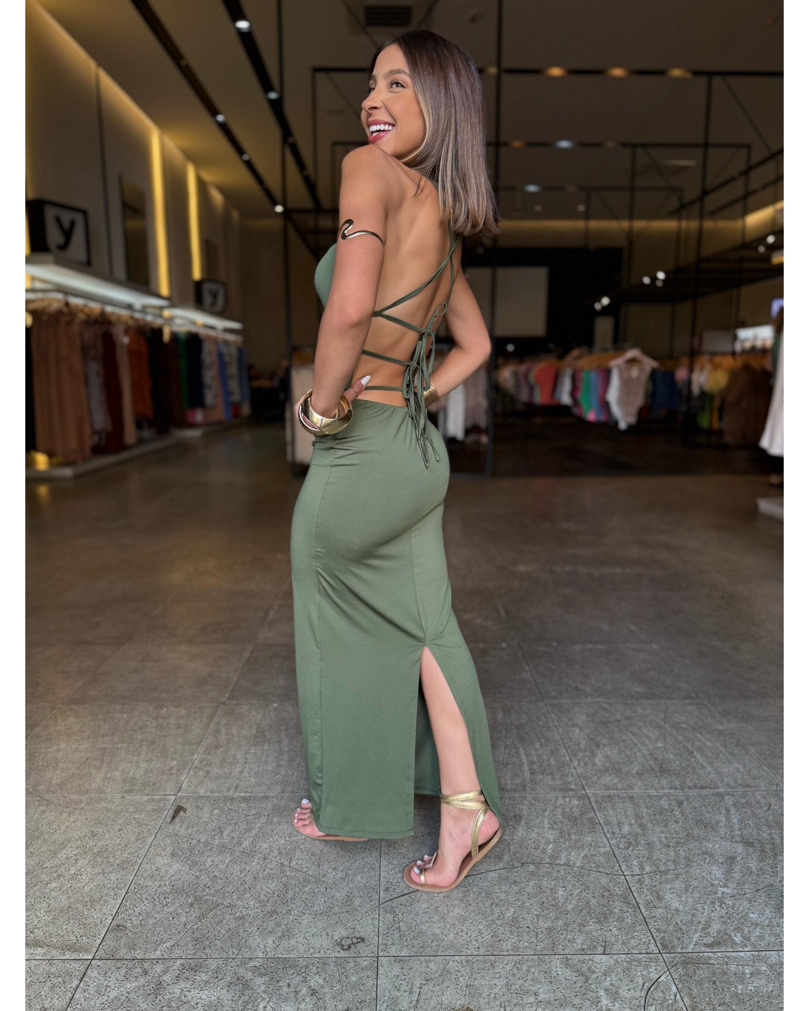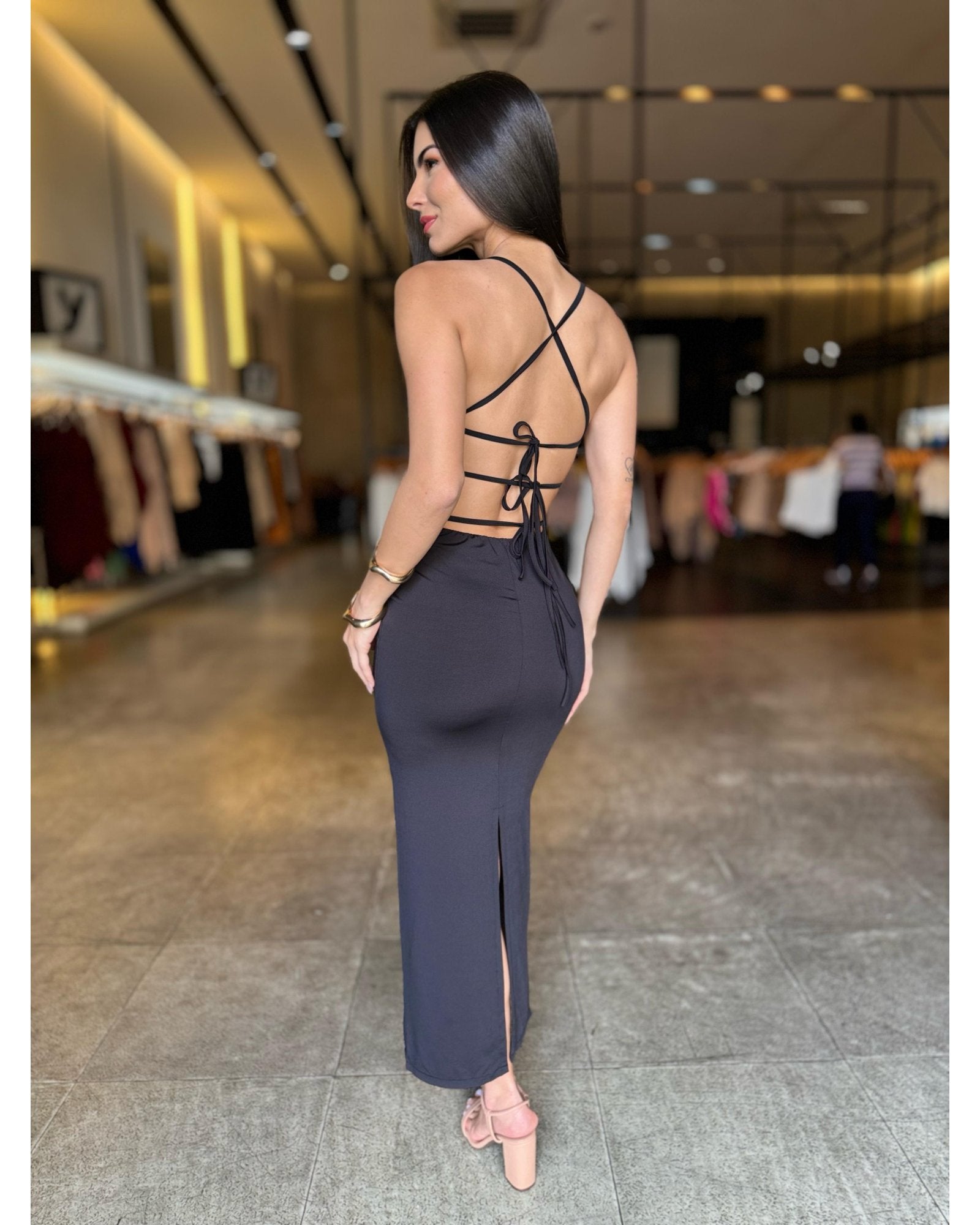 disponível no tamanho único vestindo 36 ao 42!! Vestido midi com design justo ao corpo. Possui uma pequena fenda atrás e alcinha seguindo a amarração nas costas.