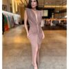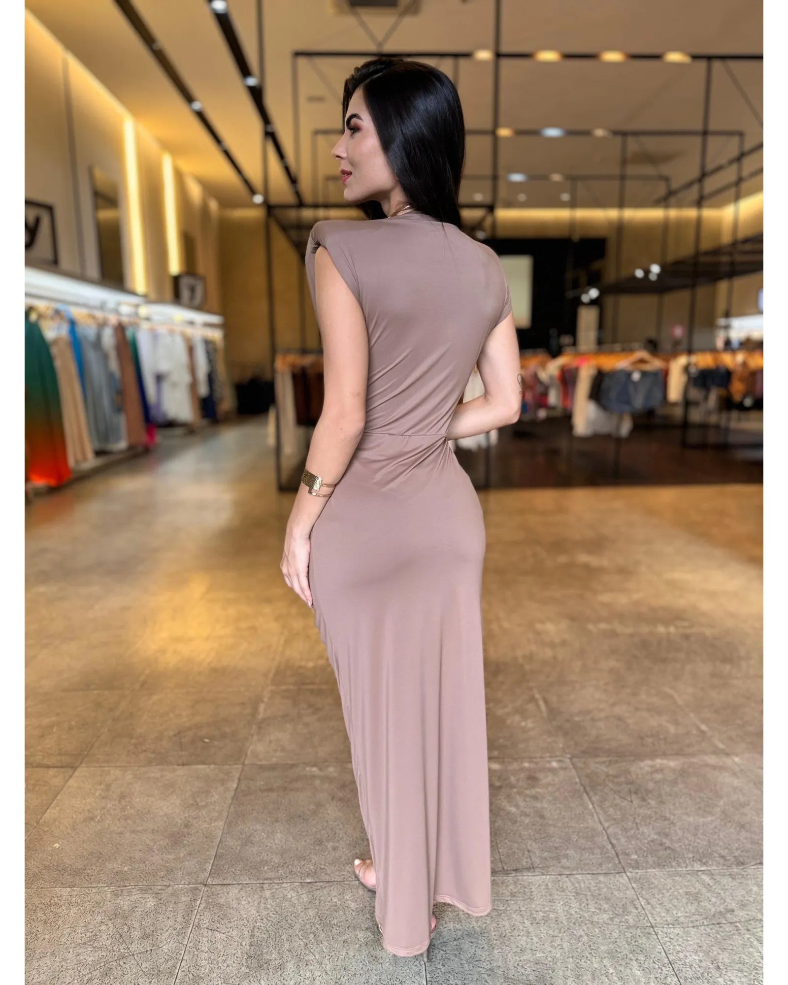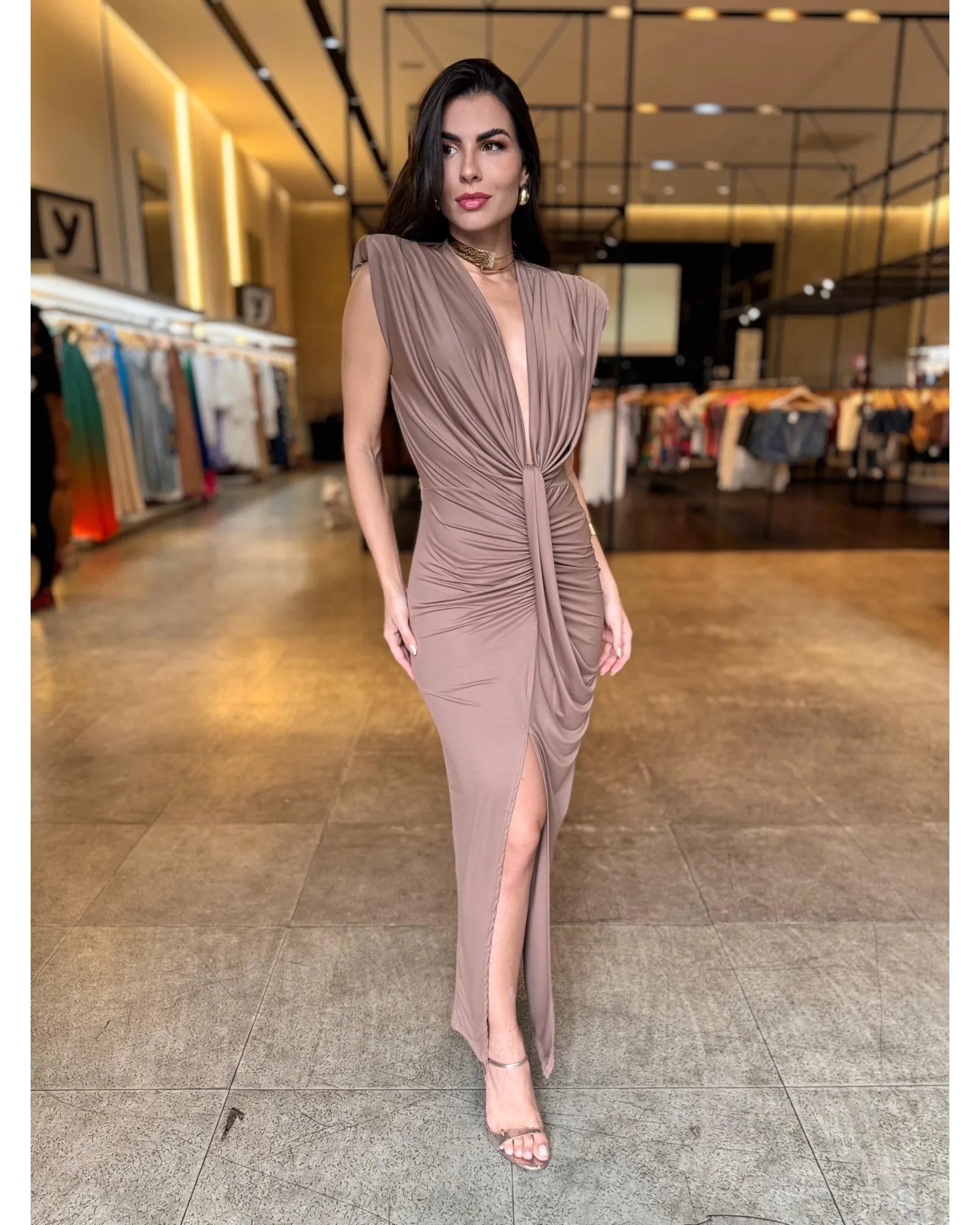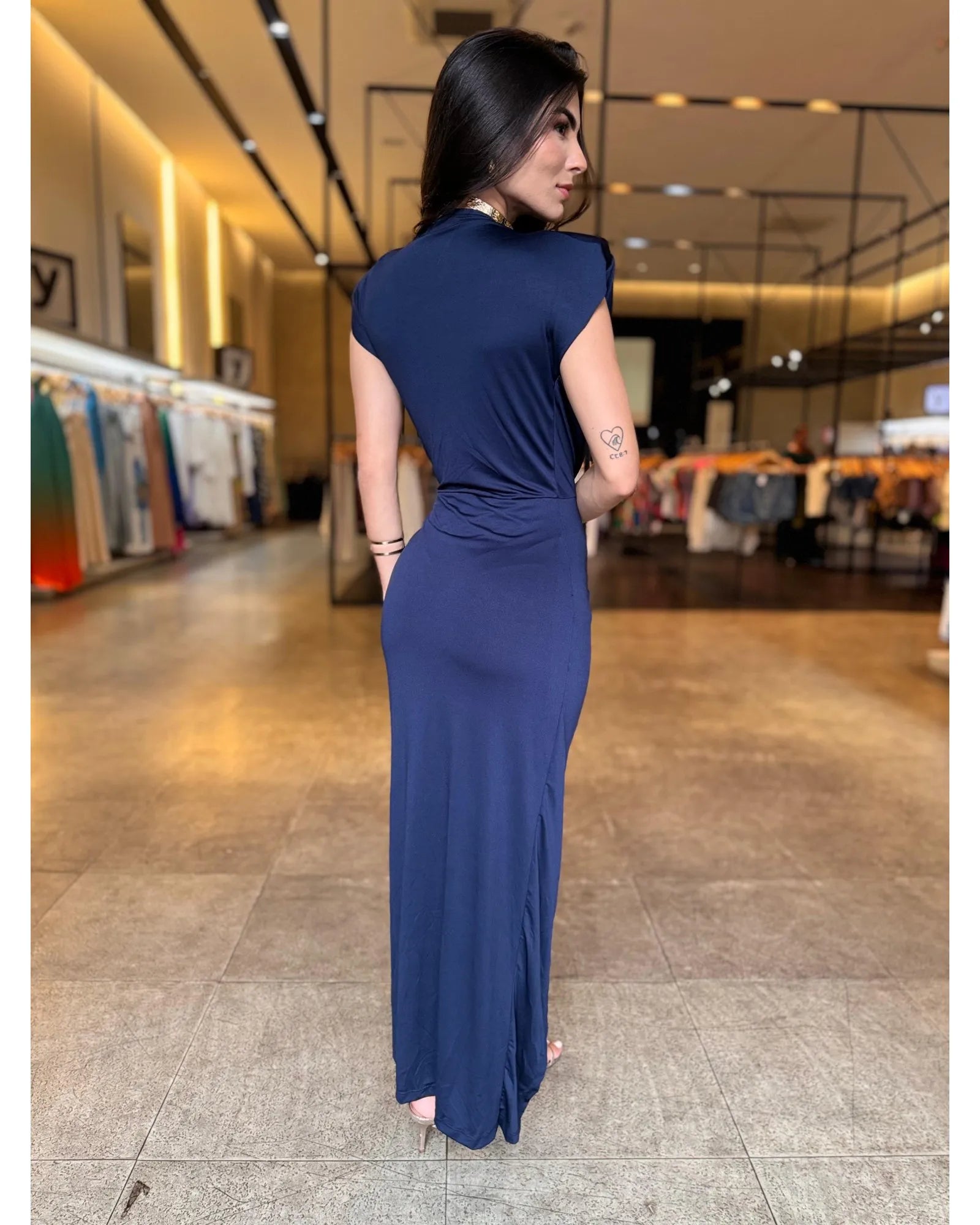 Vestido Romana, disponível em duas cores no tamanho único (38-44)!! Vestido midi em malha fria com bastante elasticidade, ombreiras estruturadas e decote em V profundo. Possui detralhes drapeados na parte frontal detalhe de nó na parte da cintura e fenda alta na frente.